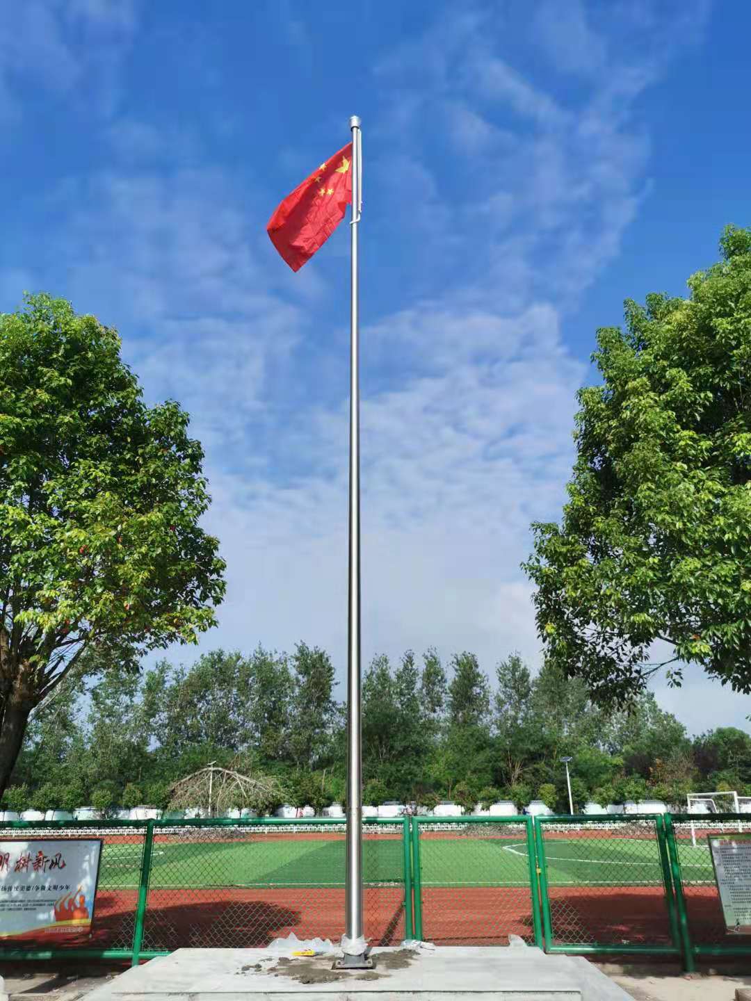 六安市裕安區(qū)順河初級中學1支12.8米錐形旗桿,此次左尚金屬安徽耀龍為六安市裕安區(qū)順河初級中學生產的旗桿為優(yōu)質不銹鋼制造,旗桿錐形挺拔高大,是錐形外置式的旗桿,內藏不銹鋼繩,旗桿外無旗繩,免去旗桿與旗繩碰撞產生刮痕,從而可能導致桿體易生銹。